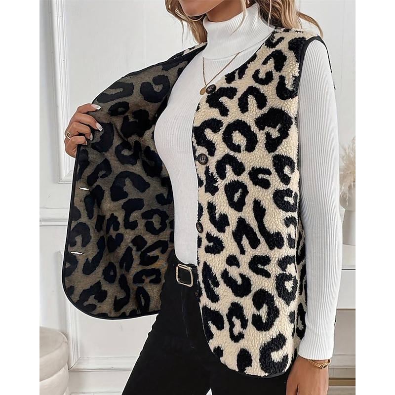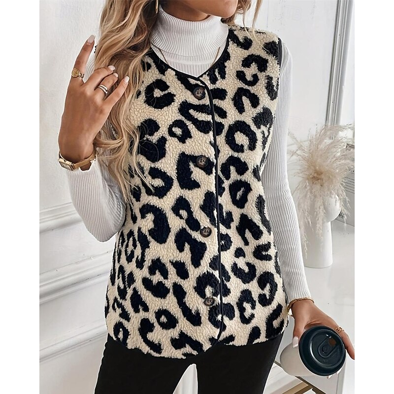 Women's Fleece Vest Vest Warm Comfortable Buttons Fleece Lined Fashion Modern Casual Leopard Going out Weekend Single Breasted Regular V Neck Regular Fit Sleeveless Outerwear Apricot Winter 5