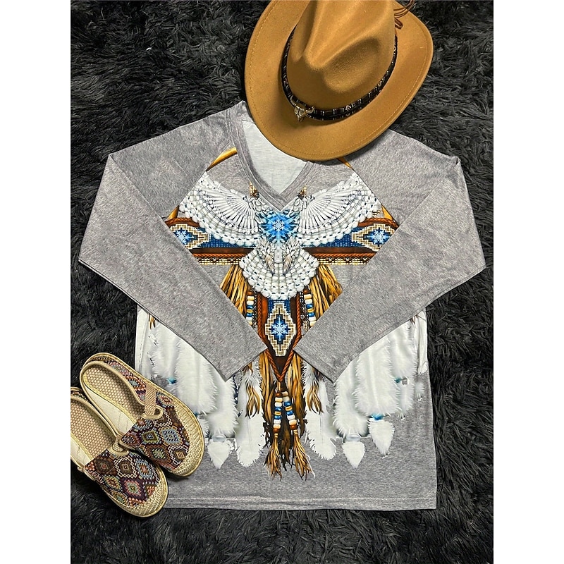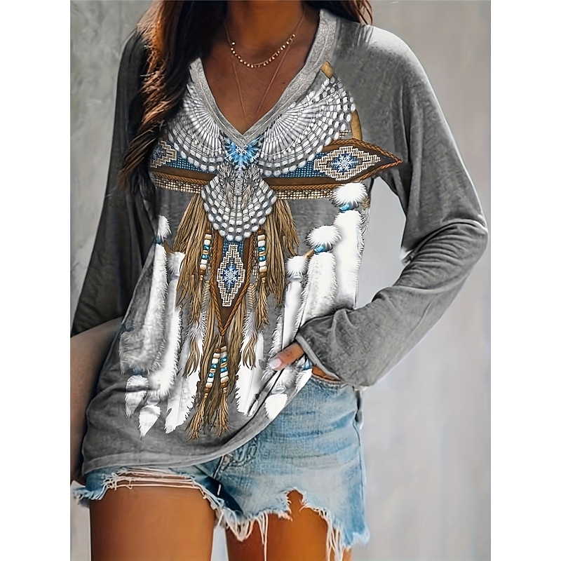 Highlights [Fabric] : Crafted from a soft, breathable polyester material, this long-sleeve t-shirt offers micro-elastic comfort, perfect for the transitional seasons of spring and fall. The fabric ensures ease of movement and a pleasant wearing experience throughout the day. [Fit] : Featuring a regular fit, this top is designed to provide a relaxed silhouette that flatters various body types. The classic V-neckline adds a feminine touch, enhancing the vintage and casual style of the piece. [Design Highlights] : The t-shirt stands out with its intricate graphic print on the front, showcasing a striking bohemian-inspired motif with feathers and bead detailing. This artistic design communicates a carefree and stylish vibe, perfect for expressing individual personality. [Occasions] : Ideal for vacation, weekend outings, and other casual settings, this versatile top complements a range of activities. Whether paired with denim shorts for a casual day out or layered under a jacket for cooler evenings, it captures a chic, boho vibe effortlessly. [Size Range] : Available in sizes S, M, L, XL, and 2XL, this women's t-shirt caters to a variety of body types, ensuring a comfortable and flattering fit for every wearer.