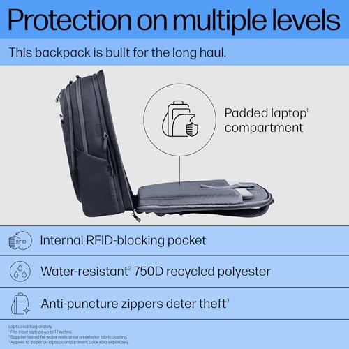 • PROTECTION ON MULTIPLE LEVELS - This backpack is built for the long haul with durable, water-resistant 750D recycled polyester; Padded compartments safeguard your laptop and accessories from bumps and bruises