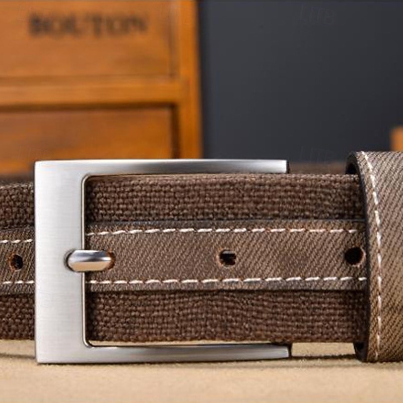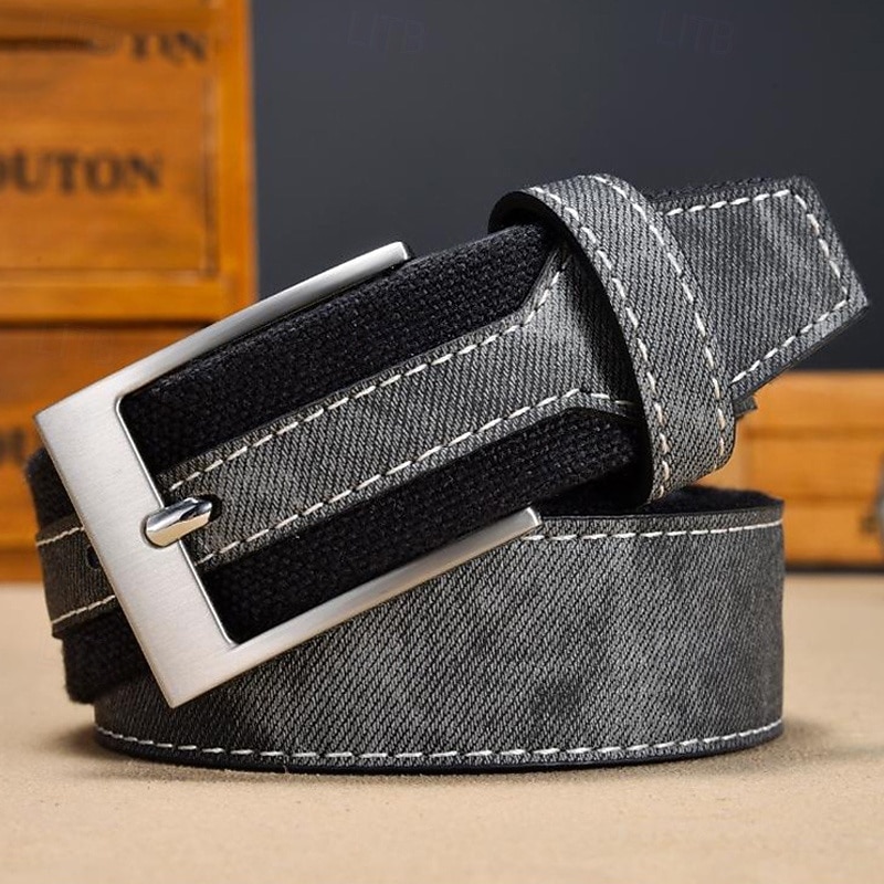Highlights [Fabric and Materials] : Crafted from a combination of durable canvas and premium alloy, this men’s belt exudes vintage charm. The exterior features a high-quality canvas material, known for its longevity and rugged appeal, while the brushed alloy buckle provides a sleek, modern contrast. The varied color options, including Blue, Brown, Coffee, and Grey, ensure versatility and the perfect match for any outfit. [Design Highlights] : This belt showcases a robust, brushed metal buckle for a contemporary and industrial feel. The use of visible white stitching offers a refined touch, contrasting elegantly against the rich textures of the canvas. This combination of materials and detailed stitching not only enhances durability but also adds a sophisticated flair to the design. [Versatility and Occasion] : Ideal for daily wear and outdoor activities, this belt is a stylish accessory suitable for both casual and semi-formal occasions. Whether you’re heading to a weekend nature hike or a social gathering, this belt seamlessly complements a variety of outfits, infusing a hint of rustic elegance with modern style into your ensemble. [Fit and Size] : Available in a one-size-fits-all design, the belt is adjustable to accommodate different waist sizes, ensuring a comfortable and tailored fit for any wearer. This adaptability makes it a practical addition to any wardrobe, offering style and convenience in one accessory.