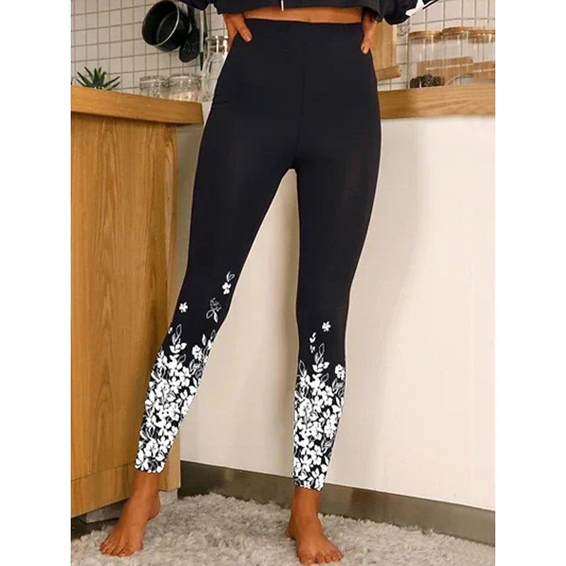 Highlights Women's Leggings [Fabric] : Crafted from a premium polyester and spandex blend, these women's leggings are designed to offer high elasticity and comfort. The fabric is soft, breathable, and moves with your body, making it perfect for everyday wear or low-impact exercises. [Fit] : These leggings feature a high-waisted design that provides excellent support and offers a flattering silhouette. The skinny fit contours to your body, creating a streamlined look that enhances your natural shape with butt lift and tummy control functions. [Design Highlights] : Adorned with striking floral graphic prints, these leggings are a standout piece in any wardrobe. The eye-catching design is complemented by an ankle-length cut, while the shimmering gold sequin embellishments along the lower legs add a touch of glamour to your ensemble. [Occasions] : Versatile in nature, these leggings are ideal for a variety of settings—be it a casual day out, a weekend yoga session, or a night on the town. Pair them with different tops and footwear to create looks ranging from sporty athleisure to chic casual. [Sizing] : Available in a range of sizes from S to XXL, these leggings ensure a great fit for a variety of body types. Choose the size that best fits your measurements for optimal comfort and style.