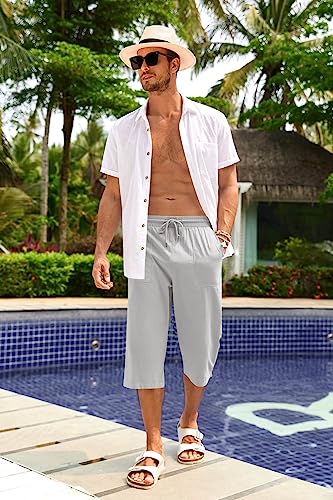 PASLTER Men's Linen Capri Pants Casual Lightweight 3/4 Pants Elastic Waist Drawstring Beach Yoga Shorts with Pockets 1