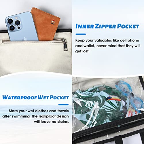 • EXCELLENT MATERIAL: Made of premium canvas, this beach bag is waterproof, sandproof and sturdy. Excellent fabric provides this tote bag with high security to protect your items from getting wet or damaged. Besides, the bottom board can flatten the bottom of this swim bag on sand or rugged places. All fabric can be machine washed and won't deform or shrink, it will be like new after cleaning.