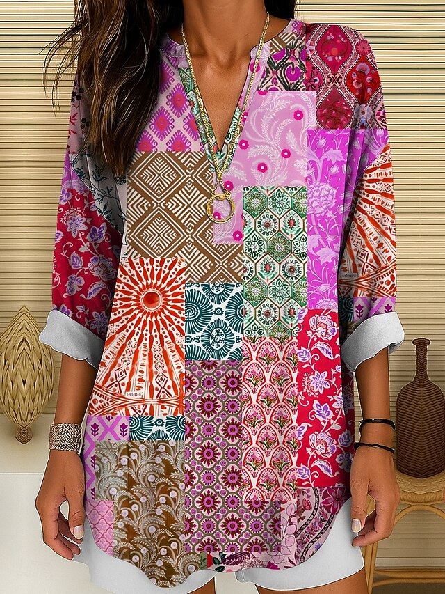 Women's Blouse Tunic V Neck Long Sleeve Boho Casual Graphic Geometric Color Block Elegant Bohemia Vintage Regular Tops Daily Wear Print Yellow Red Blue Purple Green 12