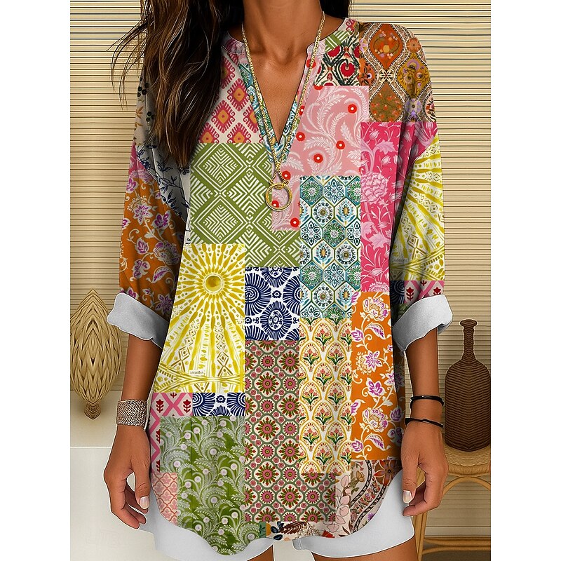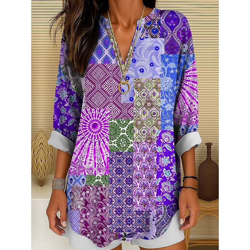 Women's Blouse Tunic V Neck Long Sleeve Boho Casual Graphic Geometric Color Block Elegant Bohemia Vintage Regular Tops Daily Wear Print Yellow Red Blue Purple Green 10