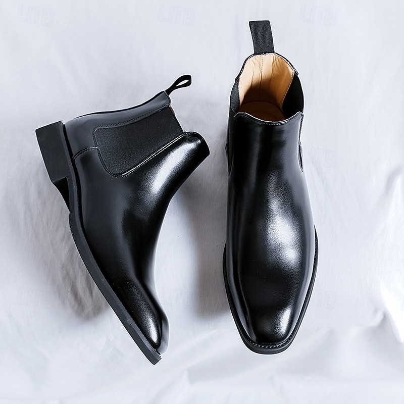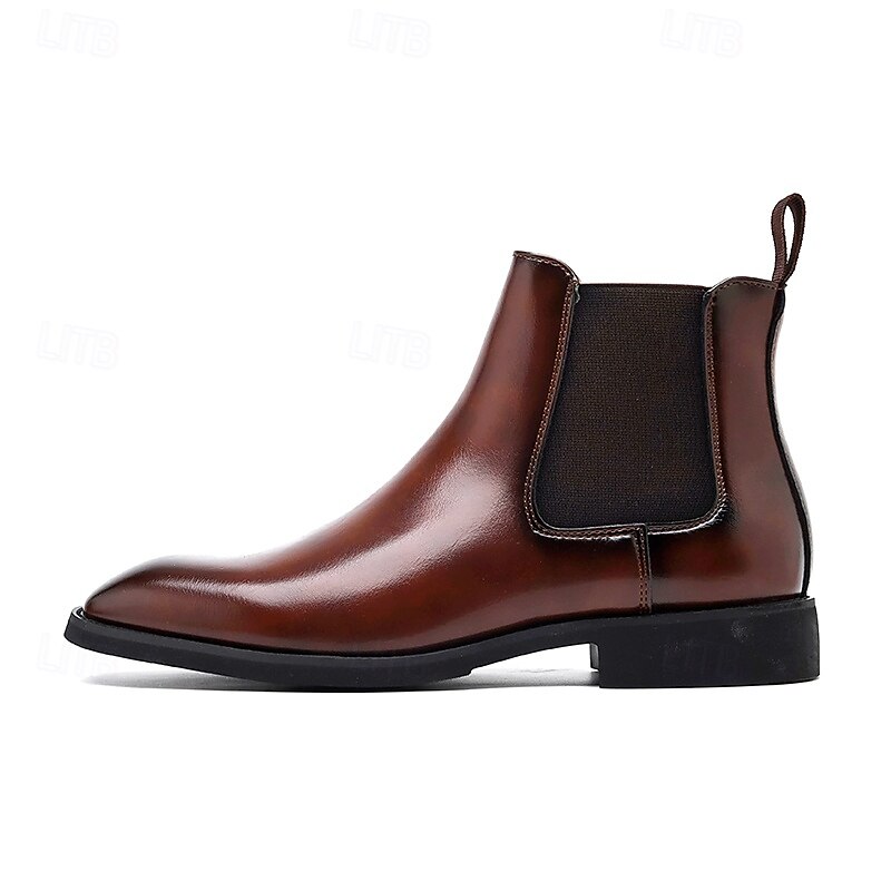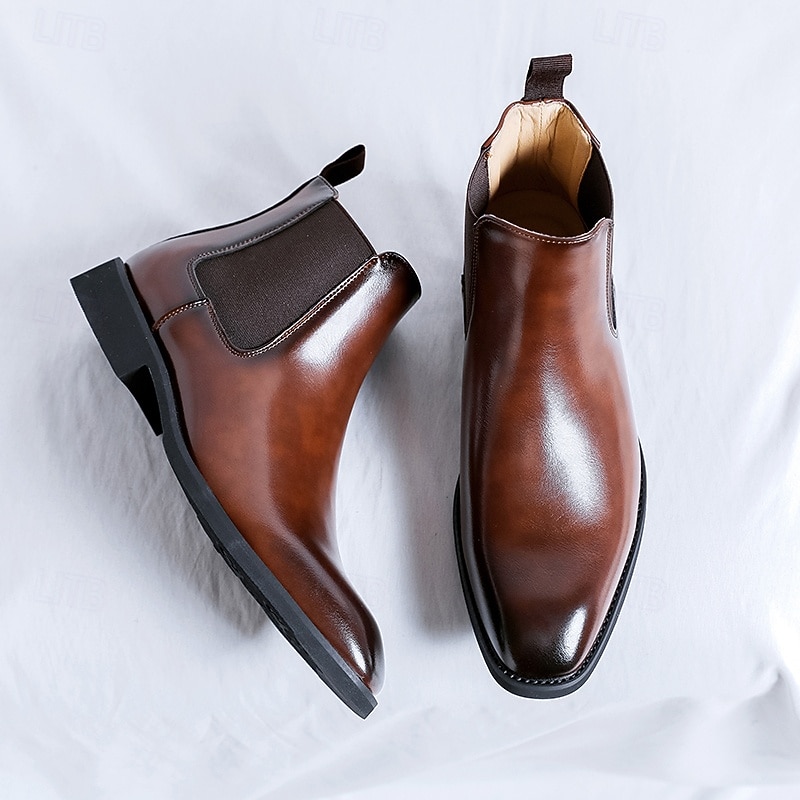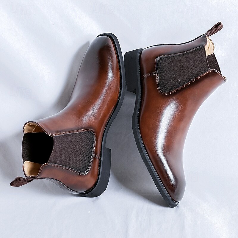 HOT ! Men's Polished Brown Faux Leather Chelsea Boots with Elastic Side Panels, Classic Business Dress Boots for Office Wear, Weddings and Evening Events