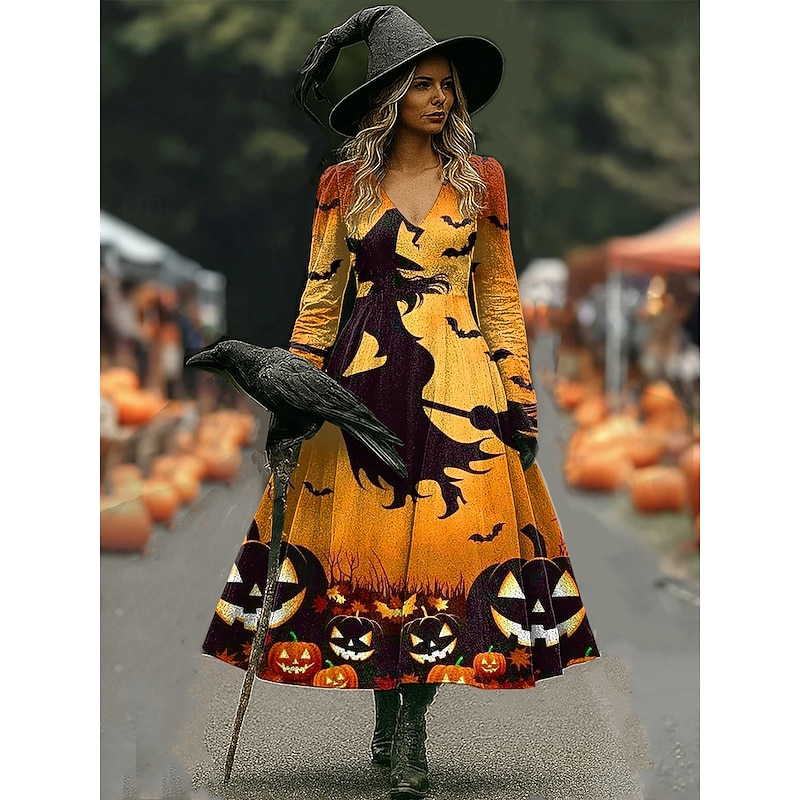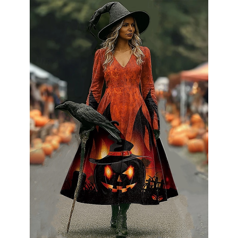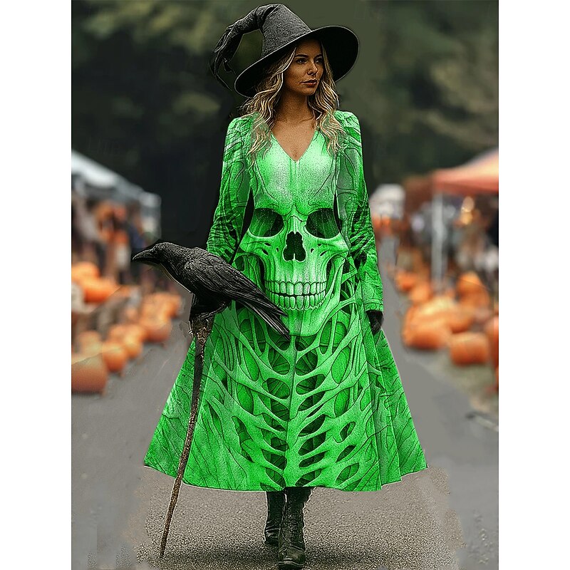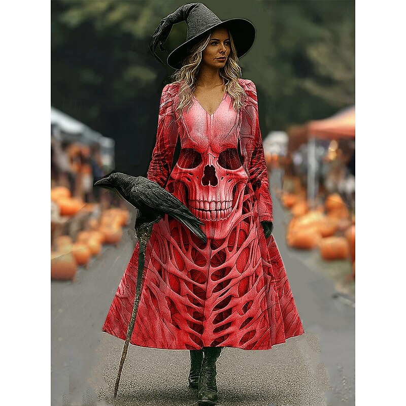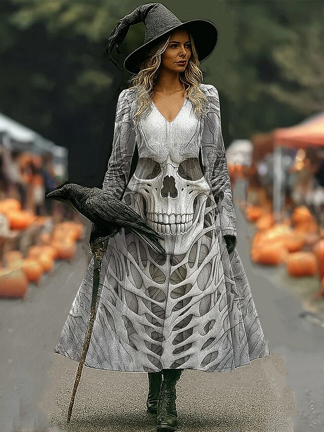 More information about Halloween Women's Skulls Print Midi Dress A Line Dress Vacation Casual Daily Regular Fit Graphic Skull Long Sleeve V Neck Blue Orange Gray Fall Winter