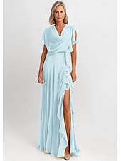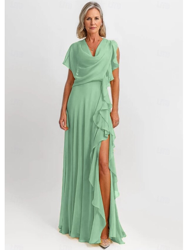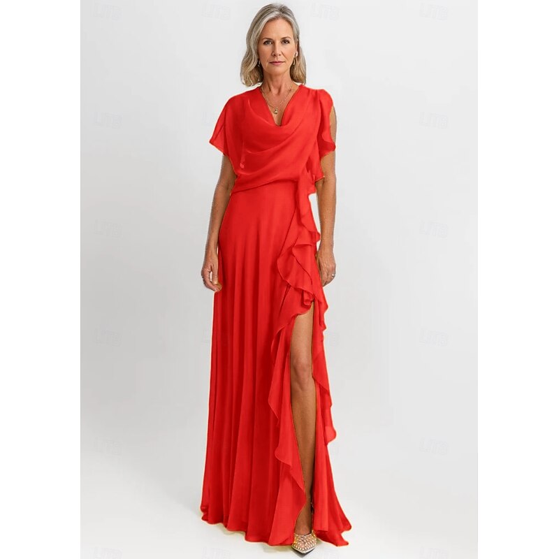More information about Ruffles A-Line Dress Mother of the Bride Dress Elegant Vintage Jewel Neck Floor Length Chiffon Short Sleeve with Tier Cascading