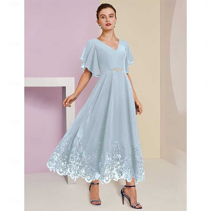 Highlights [Fabric] This elegant evening dress is crafted from a soft, lightweight chiffon that ensures comfortable wear and effortless movement. The fabric is complemented by intricate lace, which adds a touch of sophistication and delicate detail to the design. [Silhouette] Designed with a flattering A-line silhouette, this dress flows gracefully down to a tea-length hem, which exudes a sense of timeless elegance. The elegant structure of the dress flatters a variety of body types, making it a versatile choice for any formal event. [Design Highlights] Featuring a deep V-neckline and flutter sleeves, this dress offers a sophisticated and feminine appeal. The waistline is beautifully accentuated with ornate appliques and a crystal brooch, enhancing the elegant and luxurious feel of the piece. [Occasions] Ideal for formal occasions such as weddings and evening gatherings, this dress is perfect for mothers of the bride or other wedding guests. It's designed to exude class and grace, making it suitable for a variety of special events where elegance is key. [Size Range] Available in a wide range of sizes from US 0 to US 26W and with custom measurement options, this dress accommodates diverse body shapes and preferences, ensuring a perfect fit for anyone looking to make a graceful entrance.