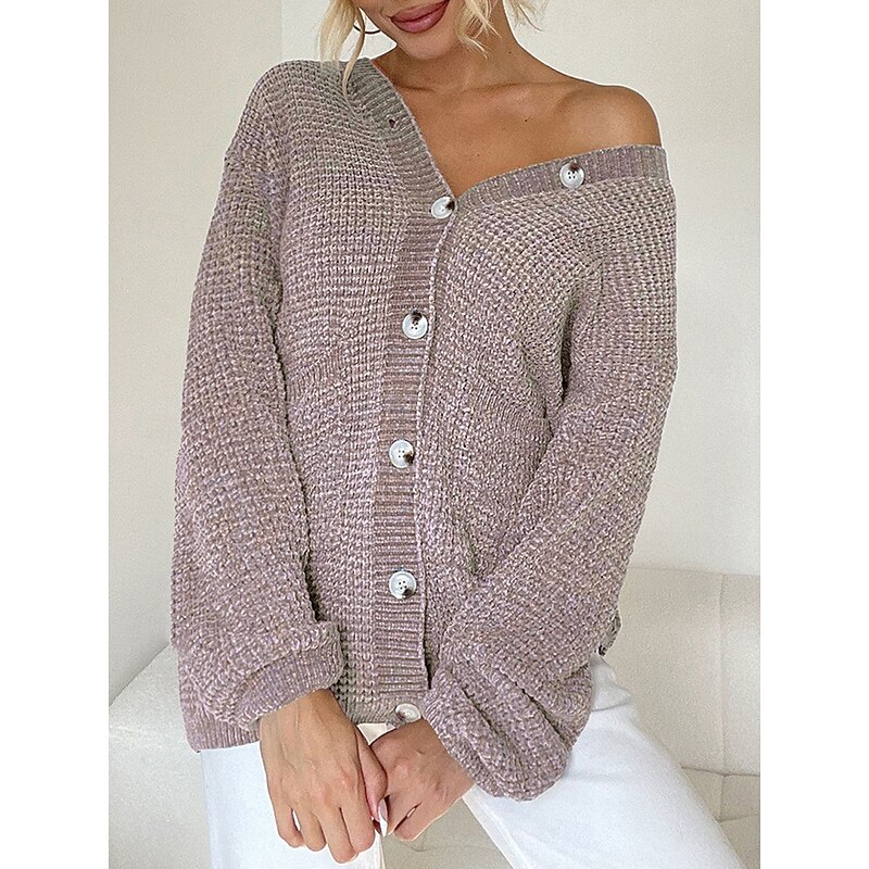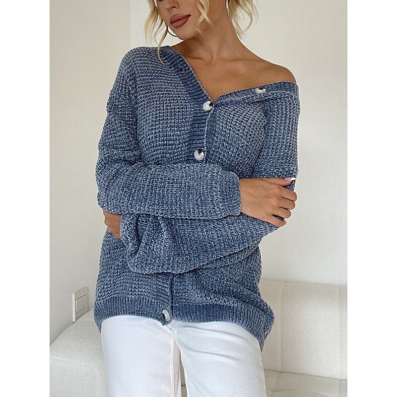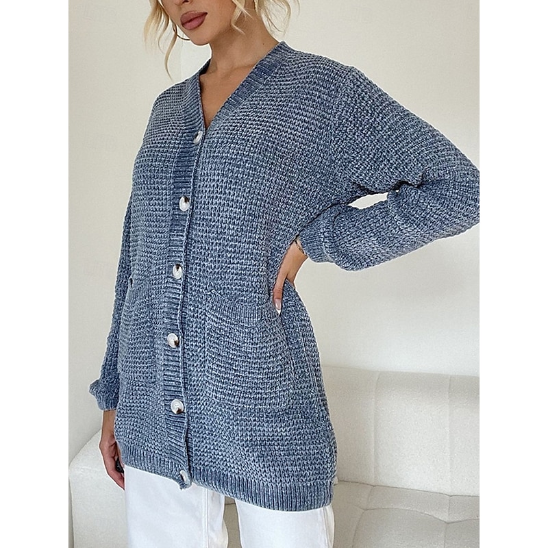 Highlights [Fabric] : Crafted from a soft polyester knit, this cardigan offers a cozy feel perfect for the fall and winter seasons. The ribbed texture provides micro-elasticity, adding comfort and flexibility to the fit. [Fit] : Designed with a relaxed, loose fit, this cardigan features long sleeves and an extended length for ample coverage and layering. It’s ideal for everyday wear, offering warmth without sacrificing style. [Design Highlights] : The cardigan showcases an elegant V-neck and is adorned with large, decorative buttons for a refined touch. Practical front pockets add functionality, while ribbed cuffs and hem give structure to the laid-back silhouette. [Occasions] : Suitable for a variety of occasions, this versatile piece is perfect for outdoor adventures, casual weekends, and daily errands. It effortlessly complements any wardrobe and can be paired with different bottoms for a personalized look. [Size] : Available in a convenient one-size option, accommodating a range of body types with its adaptable fit.