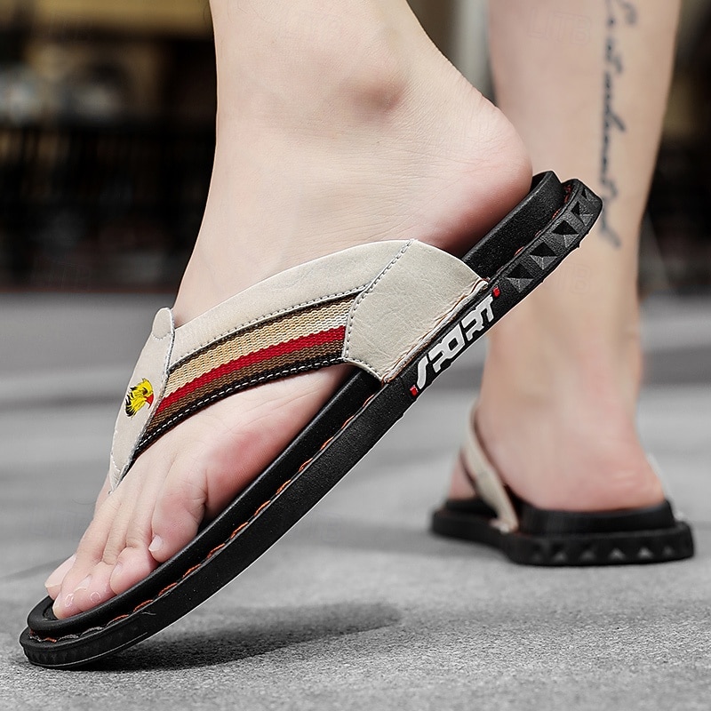 Men's Slippers & Flip-Flops Split Leather Breathable Comfortable Slip Resistant Loafer Black Khaki Beige 22