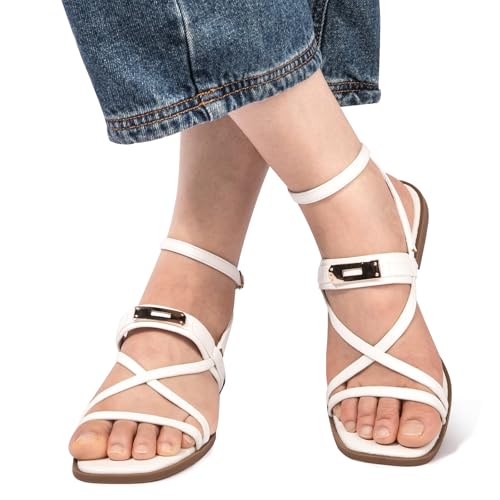 Women's Ankle Strappy Flat Sandals Comfort Gladiator Sandals Summer Casual Dressy Slides Open Toe Adjustable Buckle Slippers 6