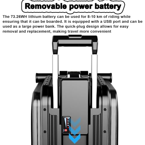 • ◉ REMOVABLE BATTERY: You'll never have to worry about running out of power with our motorized aluminum suitcase. High-capacity 73.26Wh removable battery in the suitcase that you can ride not only powers the motor but also is perfect for charging your devices through external USB ports. Thanks to its powerful 250W motor, the luggage scooter can reach speeds of up to 10km/h, with an effective range of up to 8 km