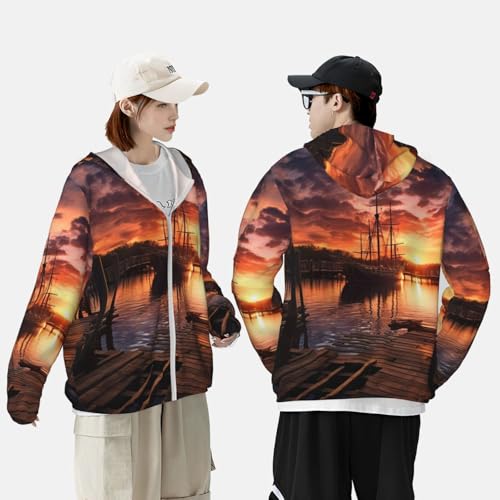 HOT ! Sun Protection Hoodie Shirt Boat harbor in the sunset UPF 50+ Long Sleeve Outdoor Rash Guard for Men Women
