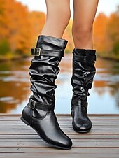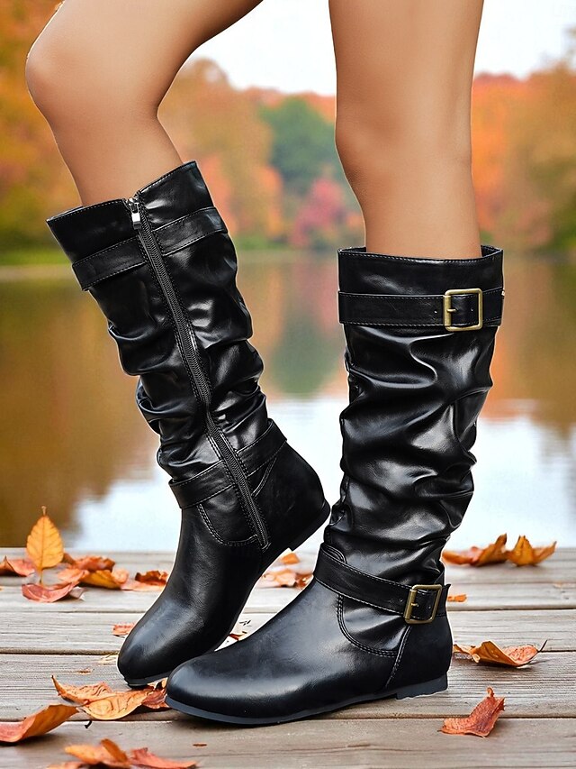 HOT ! Women's Black Faux Leather Slouch Boots with Buckle Straps and Side Zipper – Comfortable Mid-Calf Casual Boots for Fall, Winter and Everyday Outfits
