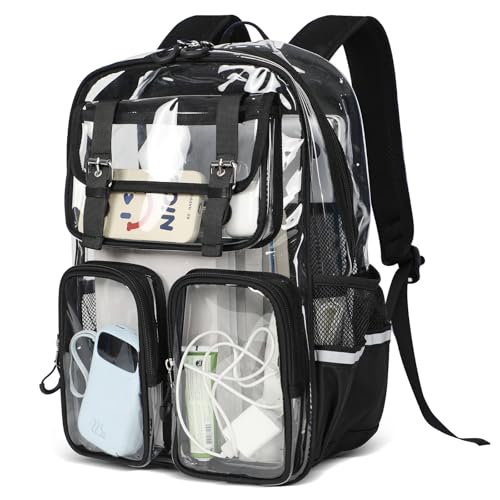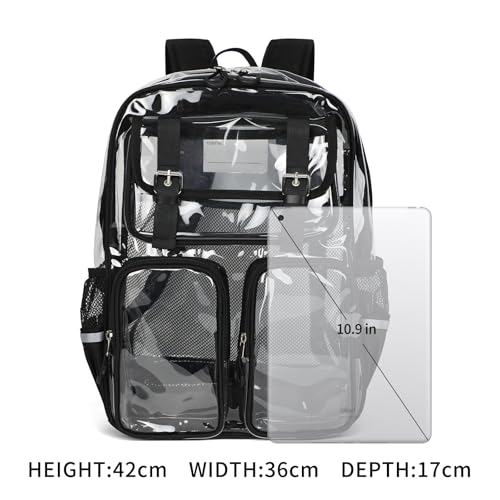 • 【Ample Storage & Smart Organization】 Measuring 12.6" x 17.1" x 6.7", this large clear backpack fits 3-ring binders, laptops (up to 16"), books, and more. Includes 2 front pockets + 2 side mesh pouches to keep supplies neatly organized and within reach.