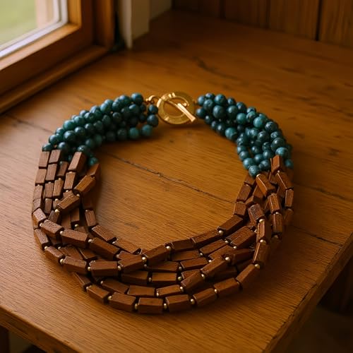 • Natural Material Warmth:Handcrafted with rustic wooden beads and cool - toned teal stone beads, this necklace blends earthy textures for a cozy fall - winter vibe. The multi - strand design adds visual warmth, making it a perfect beaded necklace to layer over chunky sweaters or knit scarves.