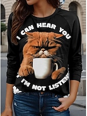 More information about Women's T shirt Long Sleeve Cat Letter Casual Long Sleeve Crew Neck Long Tops Daily Print Black Fall Winter Prefall