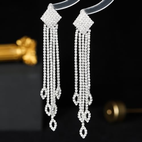 Rhinestone Drop Earrings for Women Sparkly Long Tassel Earrings Dangling Crystal Statement Prom Earrings Wedding Party Dress Outfit Jewerly Gifts 5