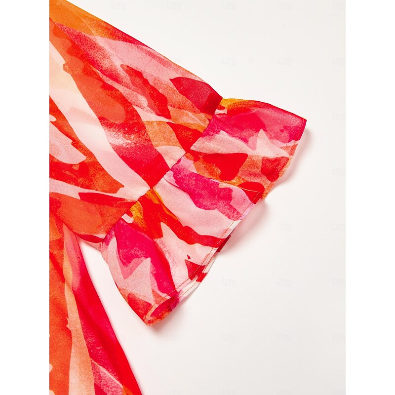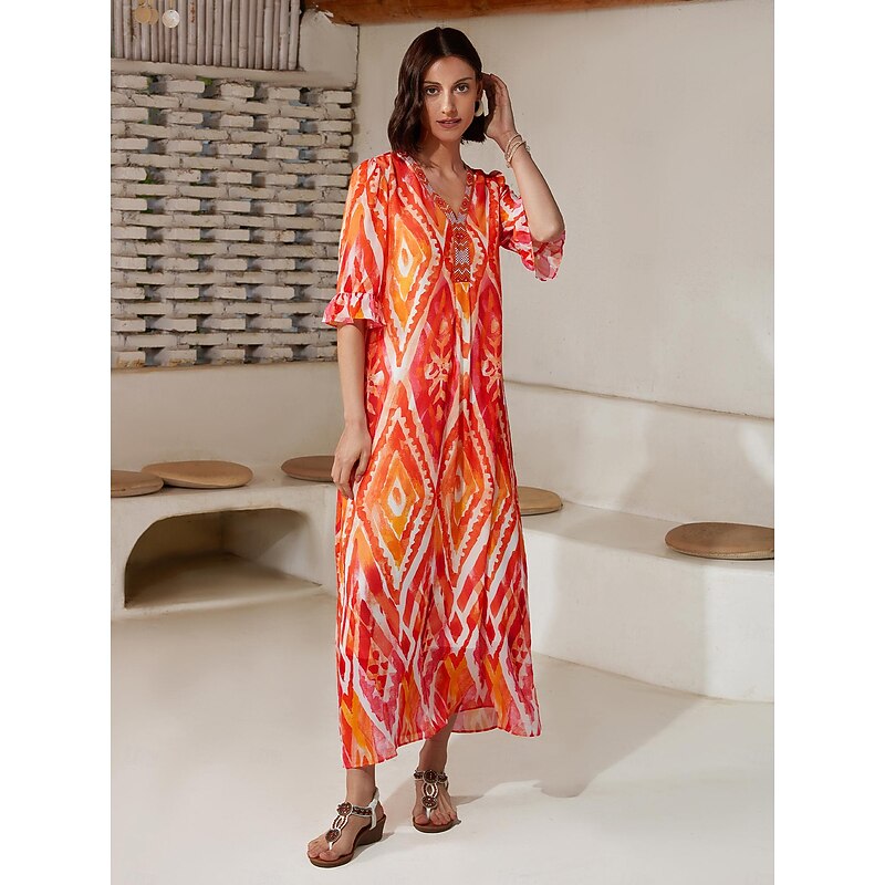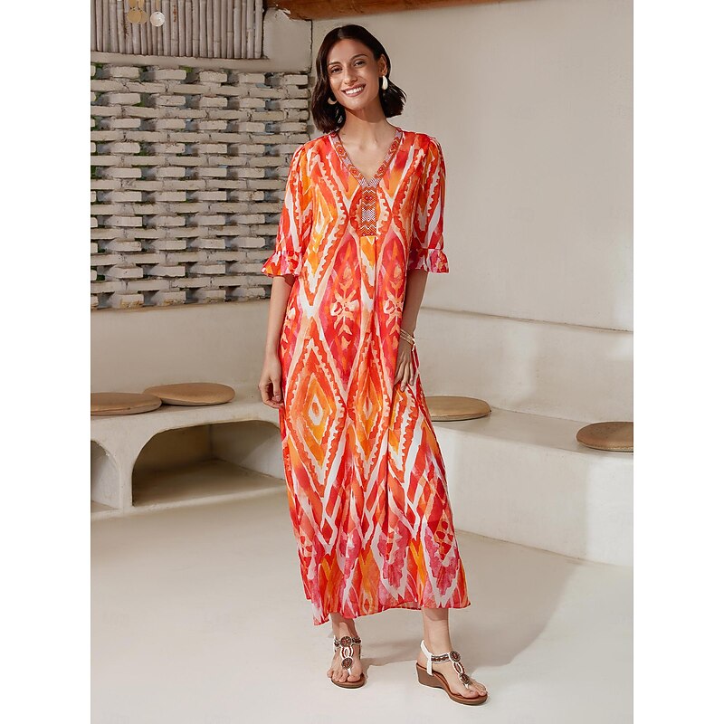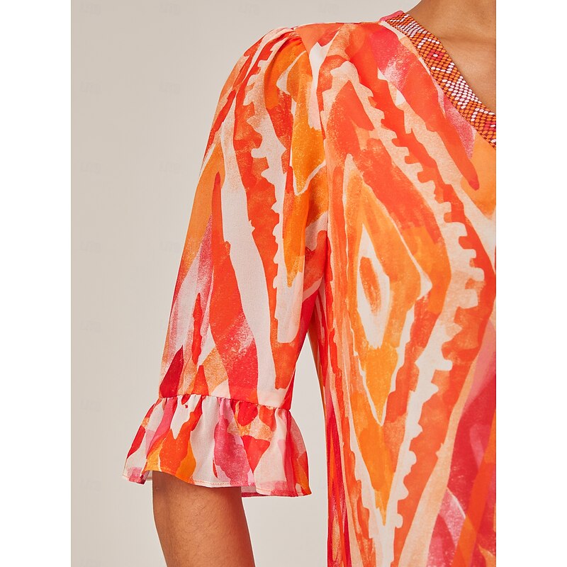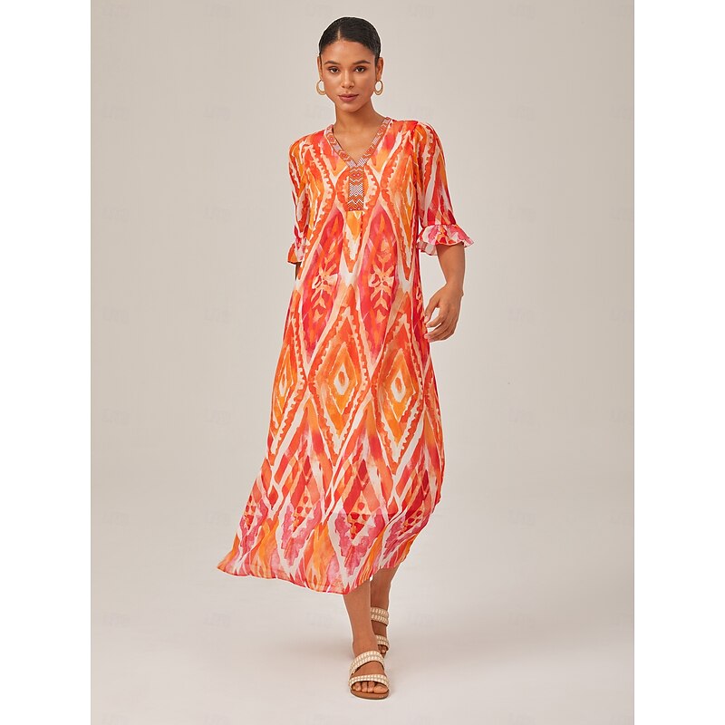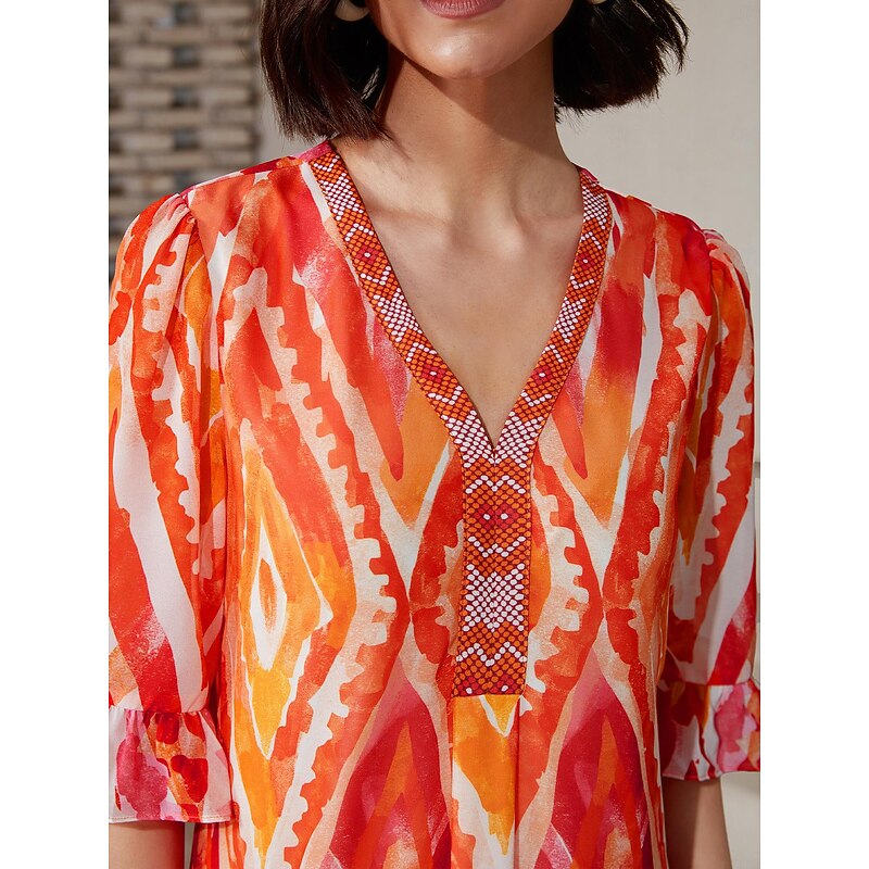 HOT ! Chiffon Ethnic Print V Neck Midi Dress