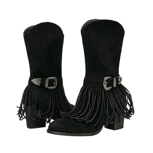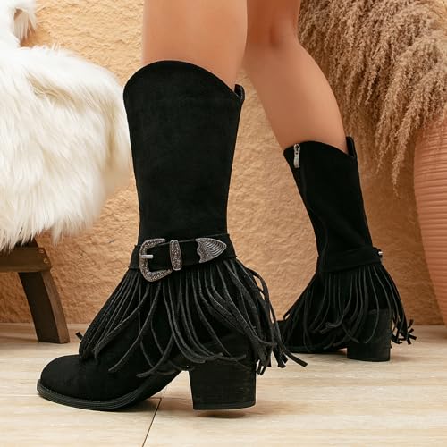getmorebeauty Women's Mid Calf Boots Low Chunky Heels Closed Toe Suede Vintage Tassels Side Zipper Ankle Boots for Autum Winter 6