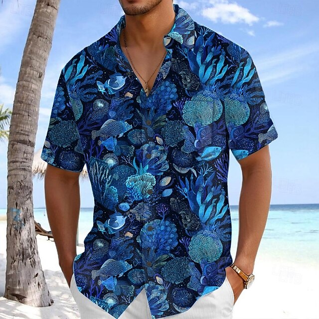 Men's Sea Creatures Coral Summer Hawaiian Shirt Button Up Shirt Aloha Shirt Short Sleeve Shirt Turndown Hawaiian Vacation Holiday Beach Wear Green Dark Blue S M L 7