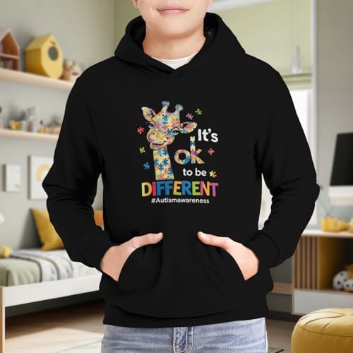 HOT ! Kids Cute Autism Awareness Cute Giraffe Animal Its Ok To Be Different Boys Girls Lightweight Kangaroo Pocket Fleece Hoodies
