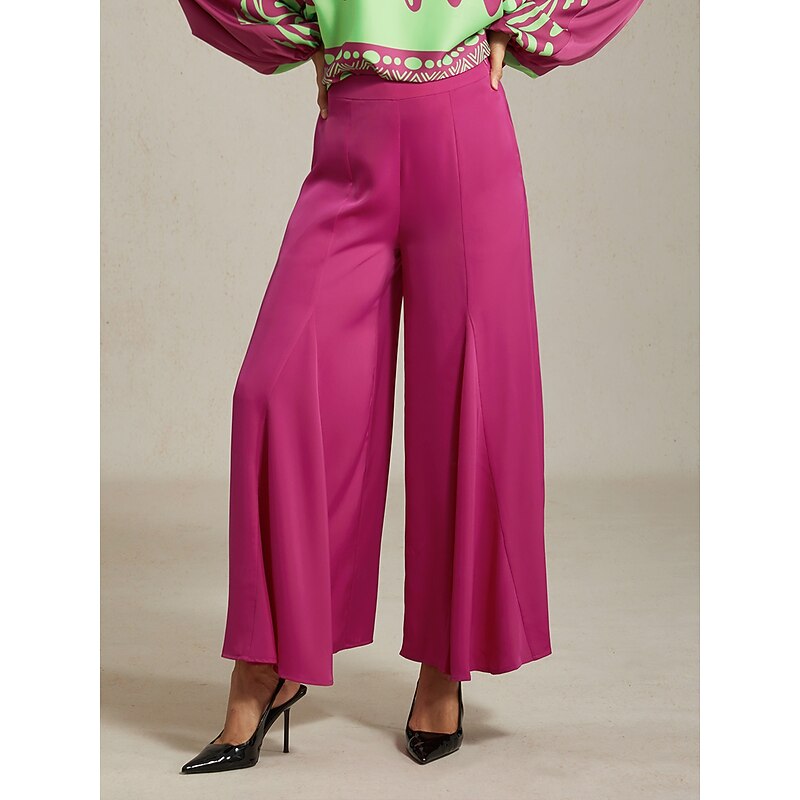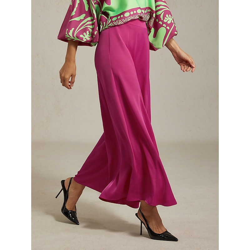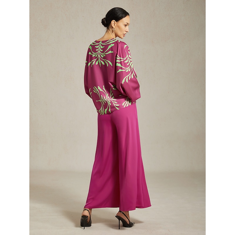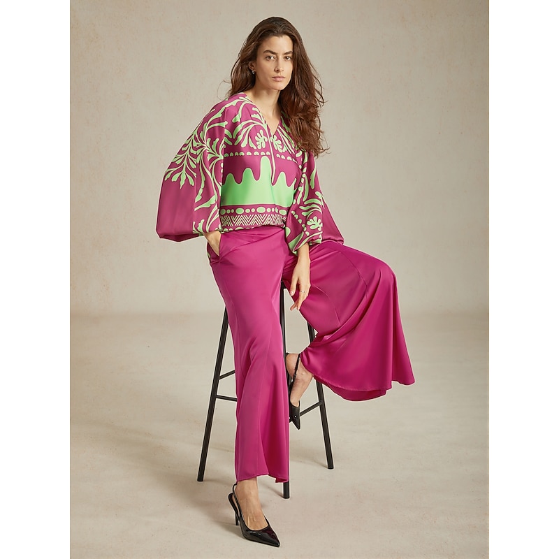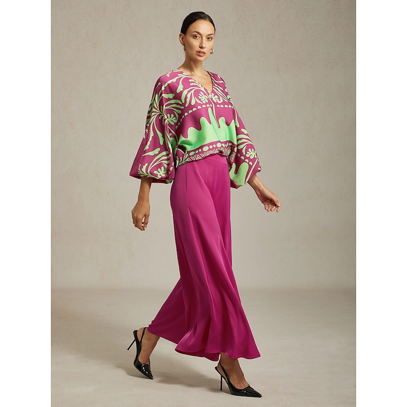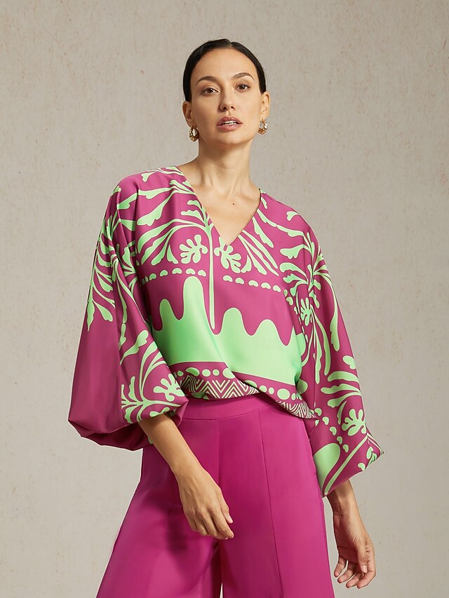 HOT ! Woman's Top Vivid Fuchsia Vacation Inspired Print Satin Lantern Long Sleeve V Neck Seaside Vacation Casual Leisure Spring Autumn