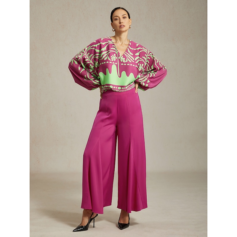 Woman's Top Vivid Fuchsia Vacation Inspired Print Satin Lantern Long Sleeve V Neck Seaside Vacation Casual Leisure Spring Autumn 2