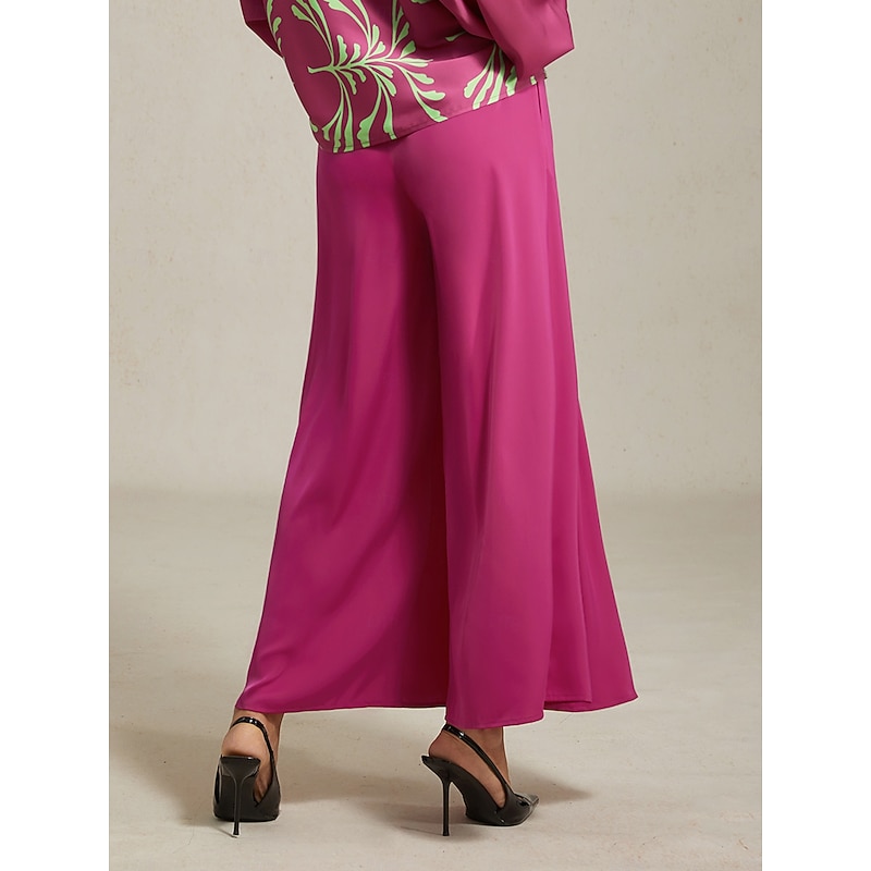 More information about Woman's Top Vivid Fuchsia Vacation Inspired Print Satin Lantern Long Sleeve V Neck Seaside Vacation Casual Leisure Spring Autumn