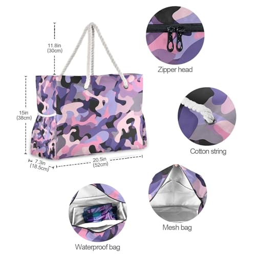 Camouflage Purple Pink Sandproof Bag For Women with side pocketes Travel Totes Bags with cup holders on side 7