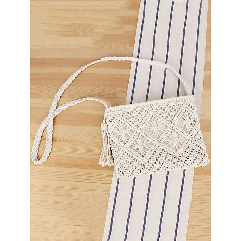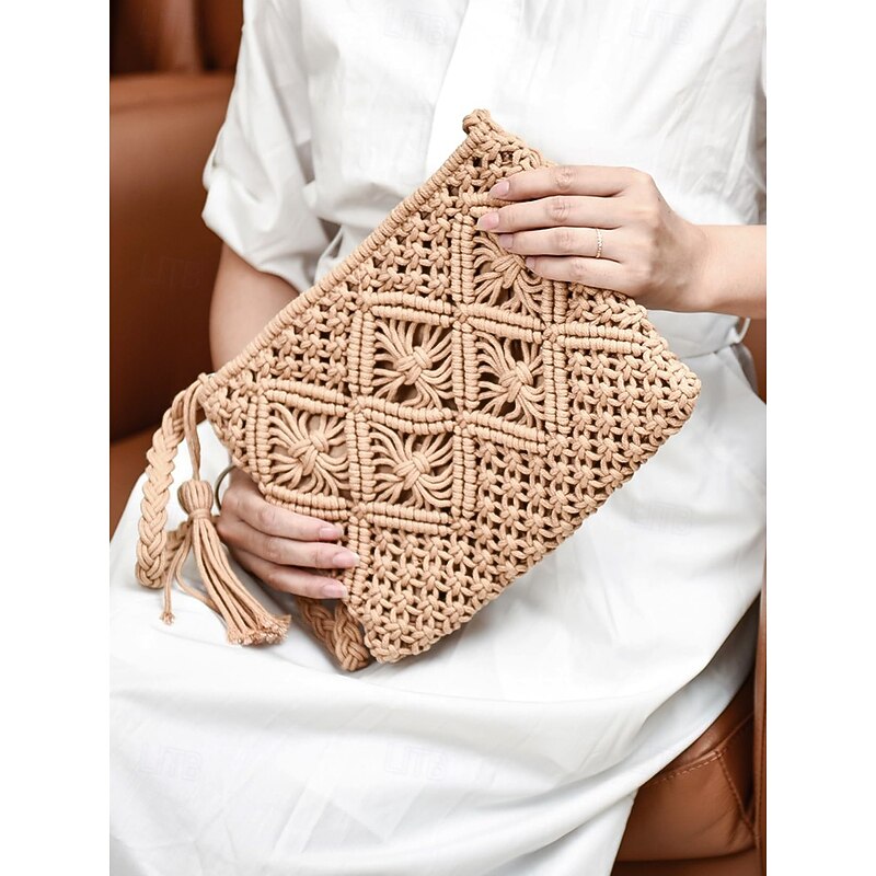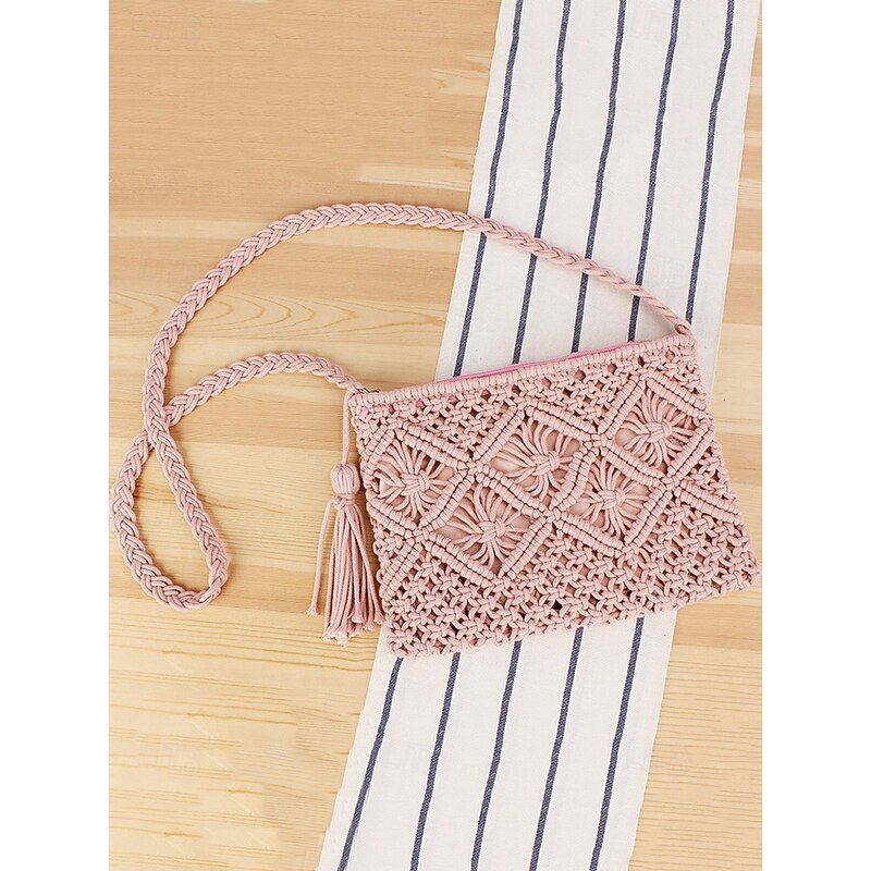 Women's Handwoven Boho Crossbody Bag – Vintage Macrame Shoulder Purse with Tassel for Beach Vacations and Casual Outfits Color Black White Pink 14