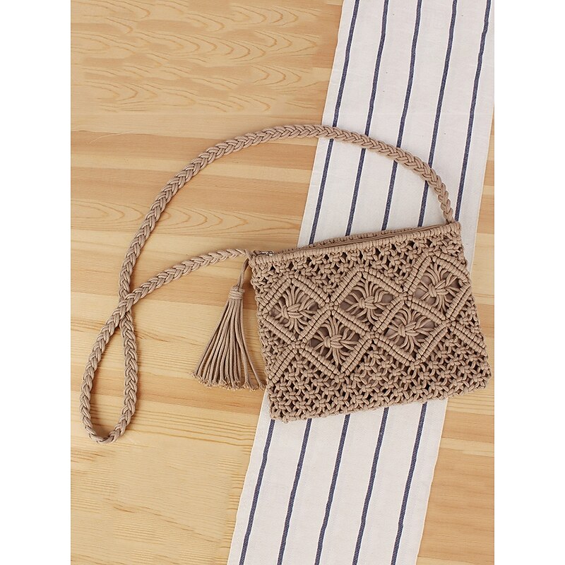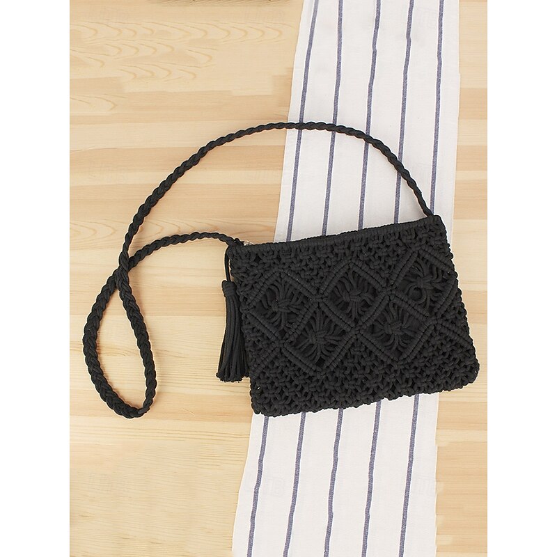 Women's Handwoven Boho Crossbody Bag – Vintage Macrame Shoulder Purse with Tassel for Beach Vacations and Casual Outfits Color Black White Pink 22