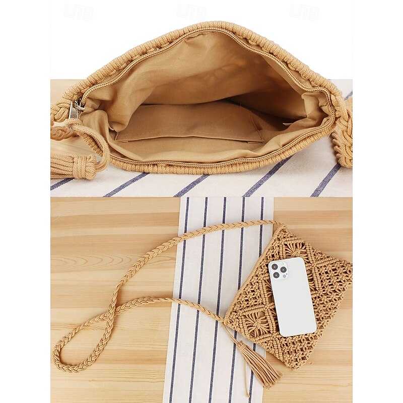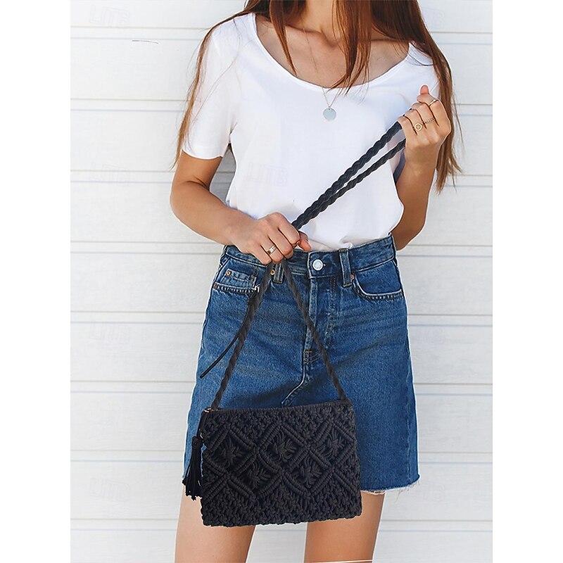Women's Handwoven Boho Crossbody Bag – Vintage Macrame Shoulder Purse with Tassel for Beach Vacations and Casual Outfits Color Black White Pink 15