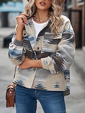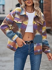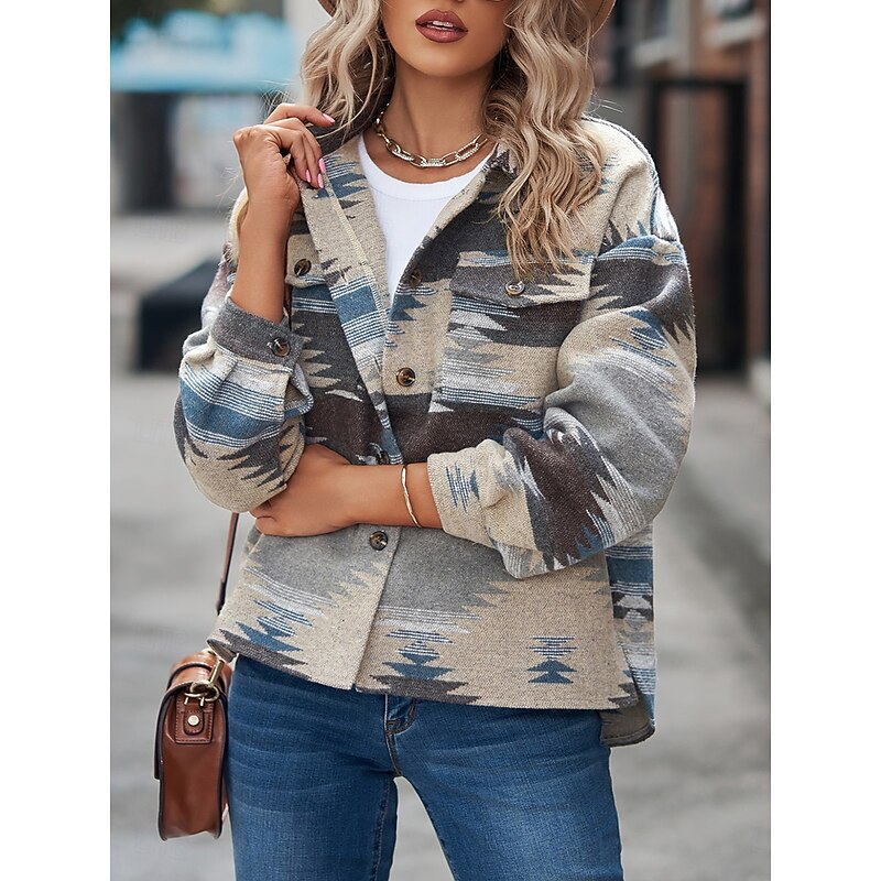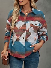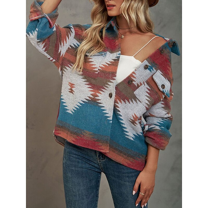 Highlights [Fabric] : Crafted from a cozy, woven fabric, this women’s casual jacket offers a perfect balance of warmth and comfort, making it an excellent choice for cooler days. The micro-elastic material ensures a comfortable fit. [Fit] : The regular fit of this jacket provides a slightly relaxed silhouette, ideal for layering over tops while maintaining a stylish appearance without sacrificing comfort. [Design Highlights] : Featuring a vibrant Southwestern-inspired pattern with bold geometric designs in hues of blue, red, and brown, this jacket is a statement piece. It includes practical elements like a classic button-up front with brown buttons and two flap pockets on the chest. The collared neckline enhances its sophistication. [Occasions] : Suitable for daily wear and casual outings, this jacket is a versatile piece that adds a pop of color to any wardrobe. Its windproof function makes it perfect for being outdoors, while its vintage style adds a fashionable touch. [Size Range] : Available in sizes S, M, L, XL, and XXL, ensuring a great fit for a variety of body types and preferences.