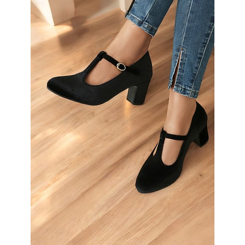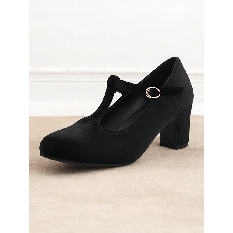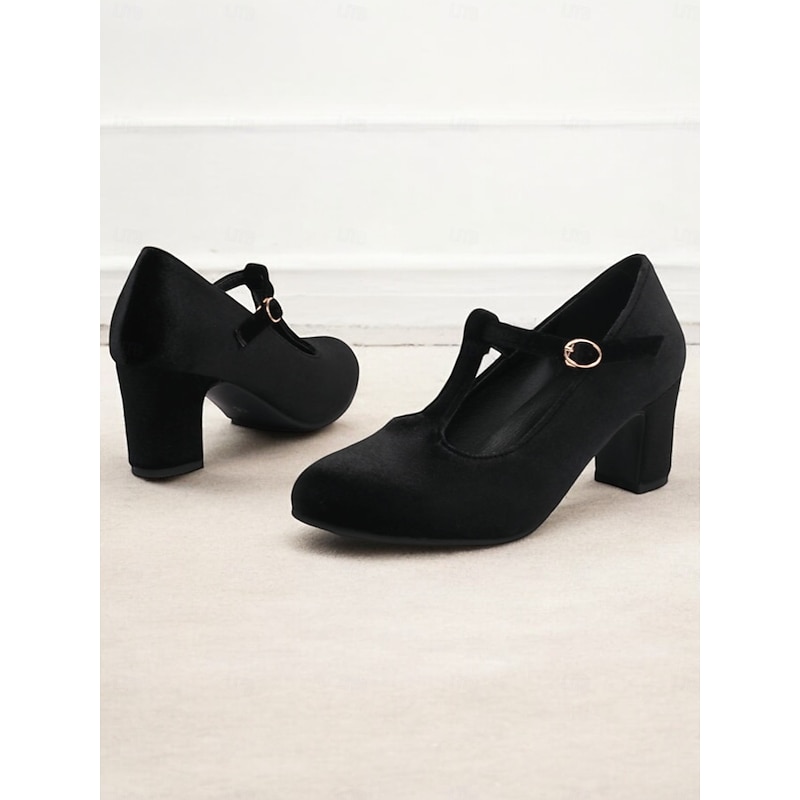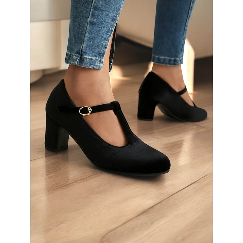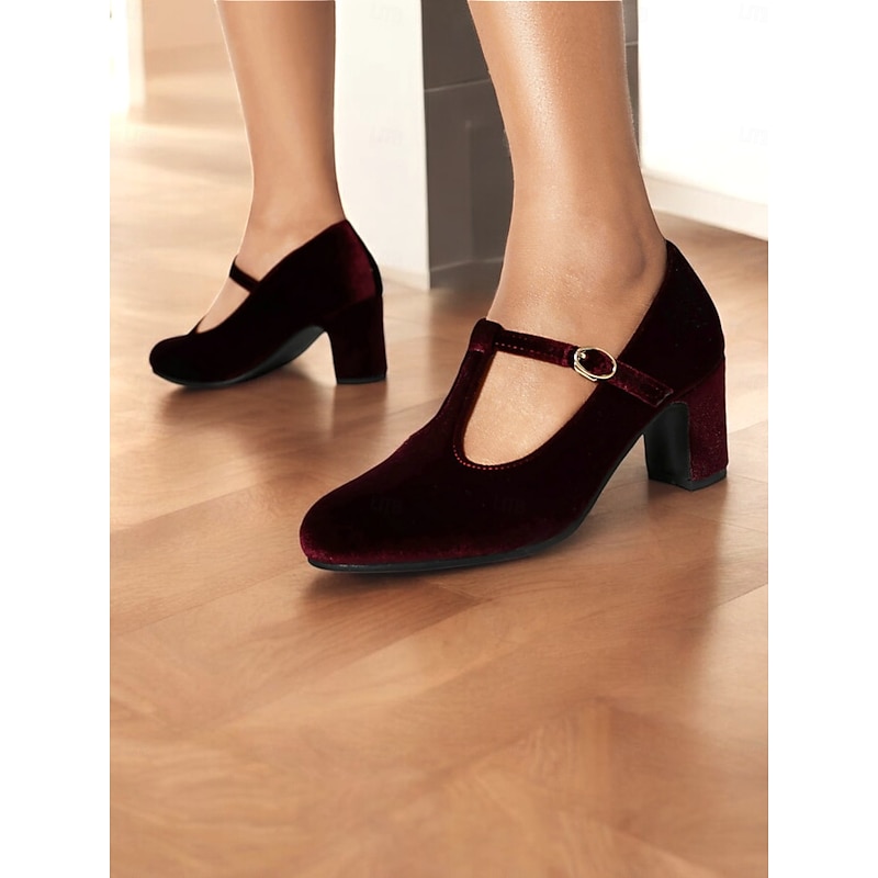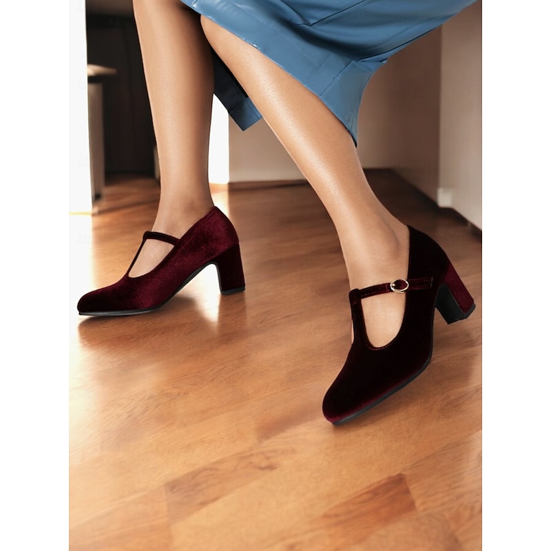 Highlights [Fabric] These heels are crafted from lush velvet material, offering a soft and rich texture that adds a touch of opulence to any outfit. The deep green hue enhances their luxurious feel and makes them an exquisite choice for day or night events. [Silhouette] Featuring a sturdy block heel and a round toe design, these shoes provide a blend of elegance and comfort. The block heel ensures stability ideal for prolonged wear, making these heels a versatile choice for both formal and casual settings. [Design Highlights] The vintage-inspired T-strap design is accentuated with a subtle metallic buckle, adding a sophisticated and timeless charm. These elements are complemented by the plush velvet, making the shoes a perfect combination of classic style and modern flair. [Occasions] Perfect for both formal functions and casual outings, these heels are suitable for various occasions such as parties, work, and daily wear. Their elegant design makes them adaptable for different settings, whether it’s an evening gala or a day at the office. [Size Range] Available in a comprehensive size range from US5.5 to US10.5, these shoes are designed to fit true to size, ensuring a comfortable and precise fit for all wearers.