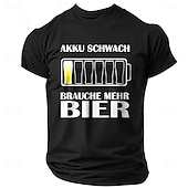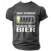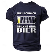 Highlights [Fabric] : Crafted from 100% soft, breathable cotton, this T-shirt ensures maximum comfort for everyday wear. The micro-elastic property of the fabric provides a comfortable fit that adapts to various body shapes and movements, making it ideal for active lifestyles. [Fit] : The T-shirt features a regular fit, combining a classic crew neck and short sleeves for a relaxed and stylish appearance. Its design offers ease of wear without compromising on style, suitable for various casual settings. [Design Highlights] : This humorous T-shirt stands out with a playful graphic design. It features a striking print of a battery level icon with the German text "AKKU SCHWACH BRAUCHE MEHR BIER" (Battery low, need more beer), delivering a bold statement in white lettering against the dark background. The fun and engaging design makes it a standout piece for any occasion. [Occasions] : Perfect for sports outdoor activities, streetwear, or casual outings, this T-shirt is designed for those with a witty sense of humor. Whether you're heading to a party or simply enjoying a relaxed day out, it makes a versatile addition to your wardrobe and can also serve as a unique gift. [Size Range] : Available in a wide range of sizes, from S to XXL, this T-shirt offers options that cater to different body types, ensuring a comfortable and flattering fit for adults.