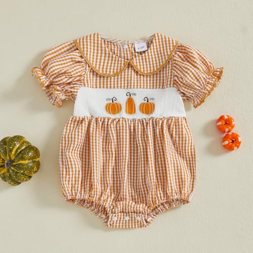 BULINGNA Newborn Baby Girl Halloween Outfit Bubble Sleeve Plaid Pumpkin Romper Summer Doll Collar Princess Clothes 1