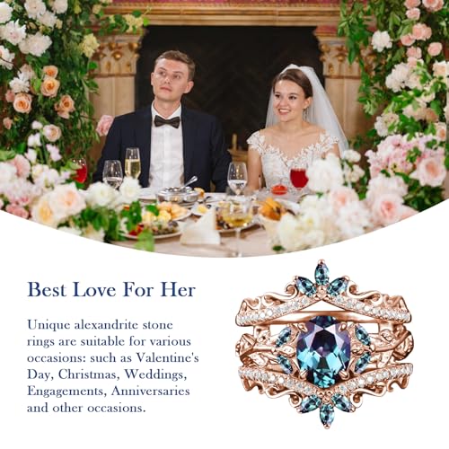 2CT Oval Color-Change Alexandrite Engagement Ring Set for Women Solid 925 Silver/10K/14K/18K Gold Bridal Ring Set Vintage Art Deco Vine Leaf Gemstone Rose Gold Ring Set for Her Unique Gifts 5