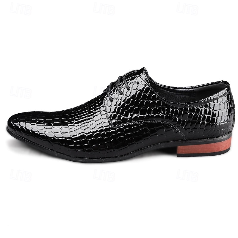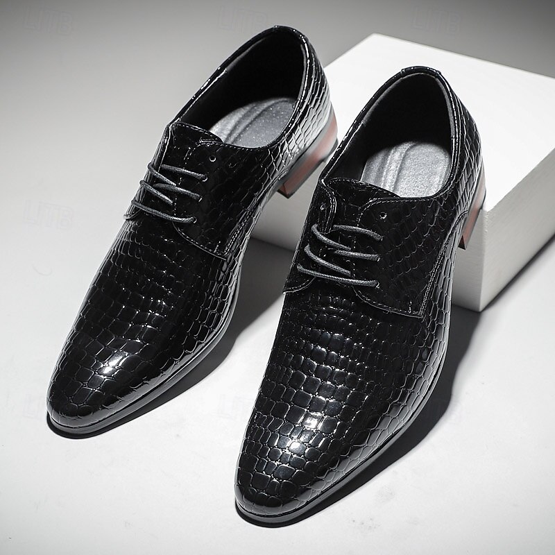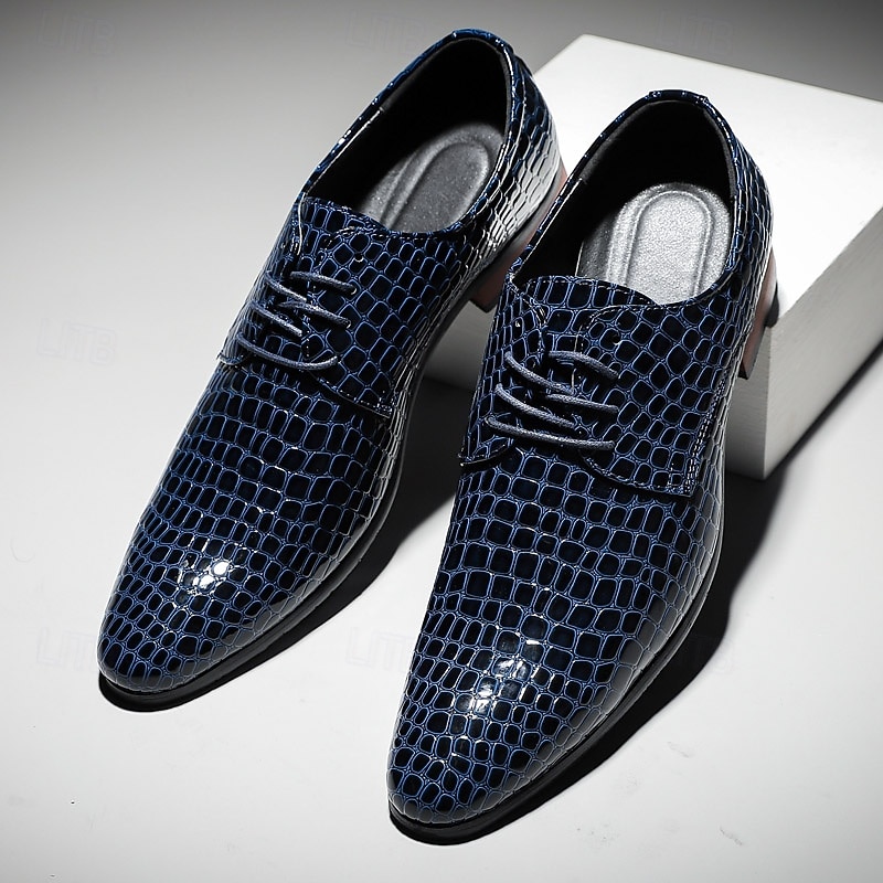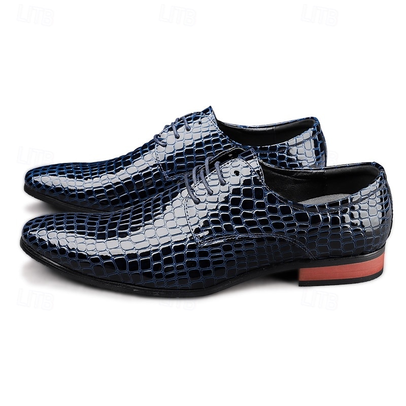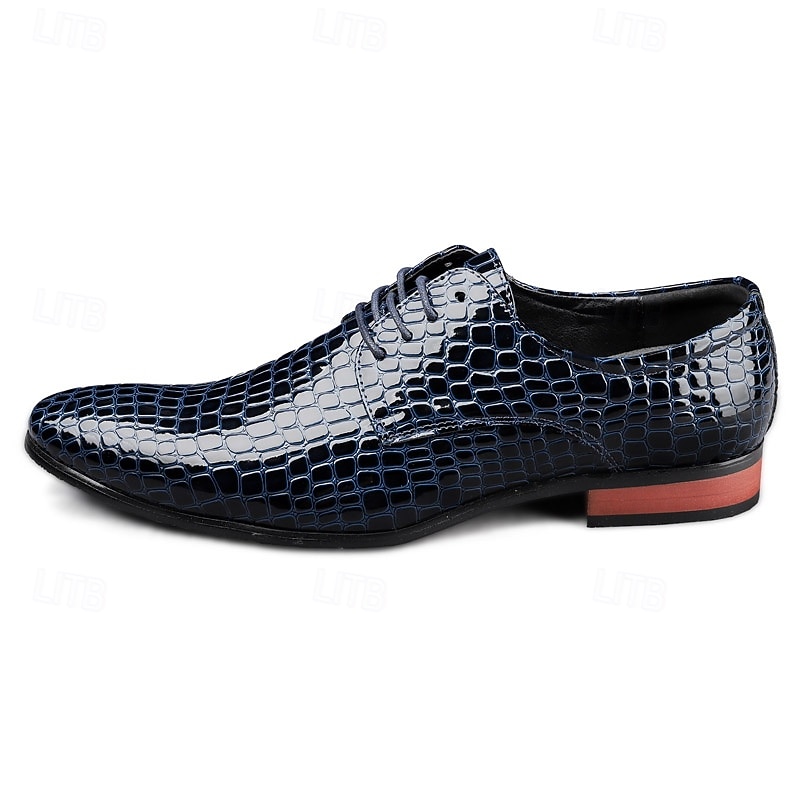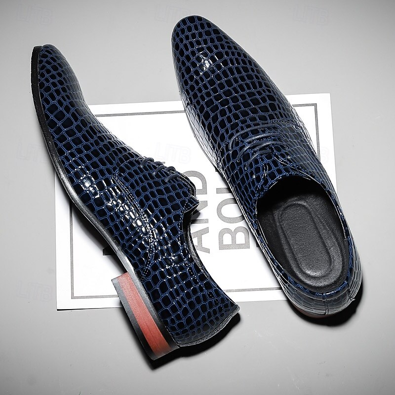 Highlights [Material & Craftsmanship] Expertly crafted from premium PU leather, these men's oxford shoes are designed with a distinctive crocodile-embossed pattern that exudes sophistication. The glossy red finish adds a luxurious shine, perfect for making a bold statement. [Fit & Style] Featuring a classic round toe and lace-up closure, these oxford shoes offer a secure fit and timeless silhouette. Their sleek patent faux leather and clean lines make them an ideal choice for formal events or enhancing a smart-casual ensemble. [Design Details] The shoes boast meticulous attention to detail, from the sophisticated crocodile pattern to the sturdy rubber outsole designed for durability. The polished finish contributes to their standout appeal, making them a unique addition to any wardrobe. [Occasions] Perfect for Christmas parties, formal events, and special occasions. Whether attending a festive gathering or a formal dinner, these shoes add a touch of elegance and charm. [Size Notice] Available in a range of sizes to ensure the perfect fit, these shoes cater to various preferences: US7 to US11.5. They are designed to accommodate your style needs with options in black, blue, and dark red.