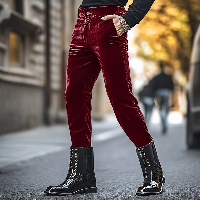 Men's Dress Pants Skinny Trousers Casual Pants Velvet Pants Pocket Plain Comfort Soft Full Length Party Daily Club Fashion Streetwear Black Red