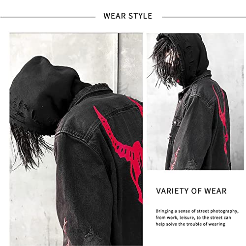 • Embroideries at sleeves, skull/cobra print and D-ring straps at back.Fashion denim jacket with frayed round hem and distressed details.Suitable for casual, hip hop, punk rock, street wear, holiday party, etc.
