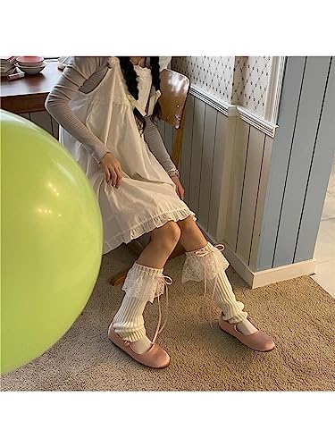 OYOANGLE Women's 1 Pair Lace Trim Bow Rib Knit Leg Warmers Y2K Kawaii Long Socks for 80s Party Dance 1