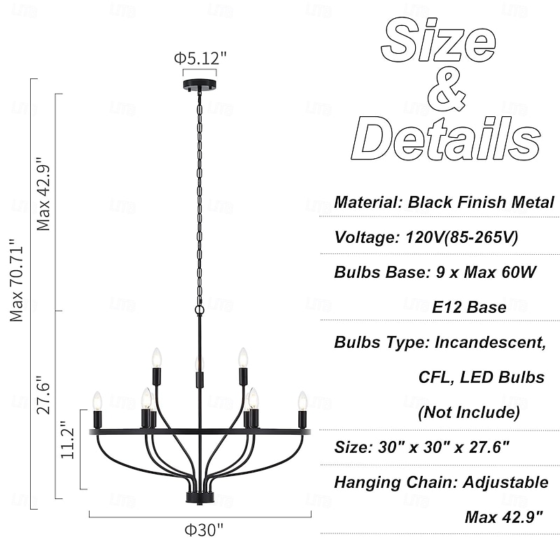 LED Pendant Light 6/9/12-Light Industrial Vintage Large Round Rustic Candle Chandelier for Living Room Bedroom 110-240V 13