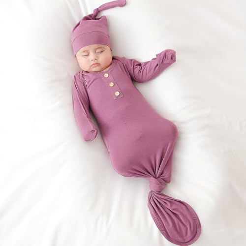 2Pack Newborn Baby Knotted Gown, Super Soft Modal Infant Long Sleeve Sleeper with Hat and Headband Set 6