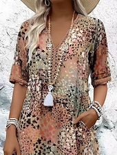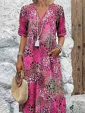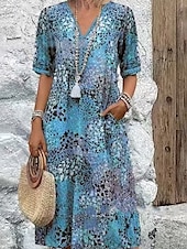 Highlights - Perfect for summer vacations - Short sleeves for a casual and classic look - Beautiful print design - Flattering V-neck neckline - Elegant midi dress length - Designed for women seeking a classic and stylish ensemble