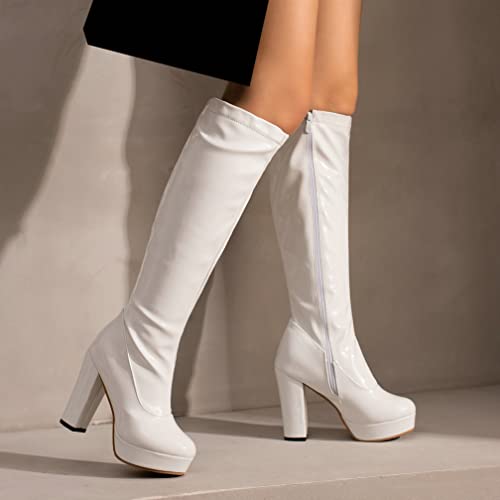 KISSASA Womens Patent Knee High Gogo Boots Chunky High Heel Platform Zip Up Boots 4