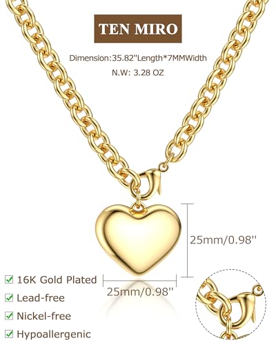 HOT ! TEN MIRO 16k Chunky Gold Necklace for Women Non Tarnish, 36'' /92cm Long Gold Chunky Heart Necklace layered Puffy Heart Necklaces Long Thick Pendant Bold Statement Necklaces for Women Trendy