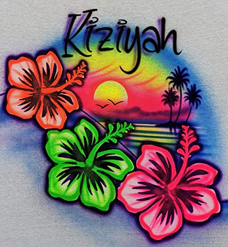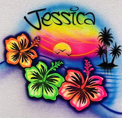 HOT ! Airbrushed Beach, Hibiscus, Palms & Sunset T Shirt, Personalized with Name