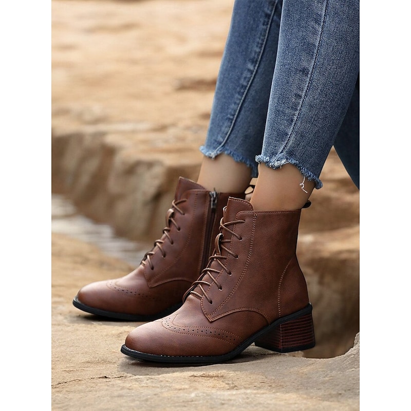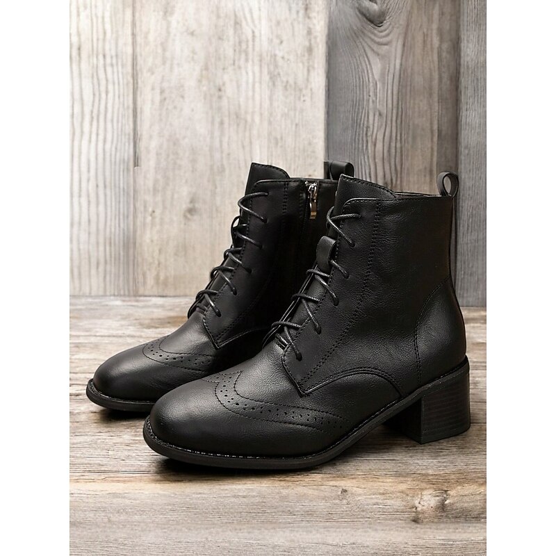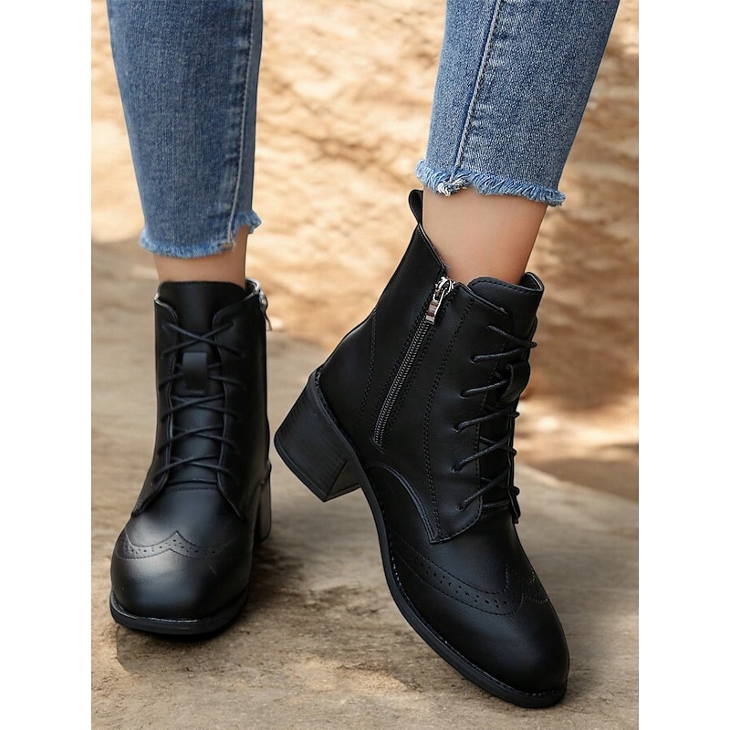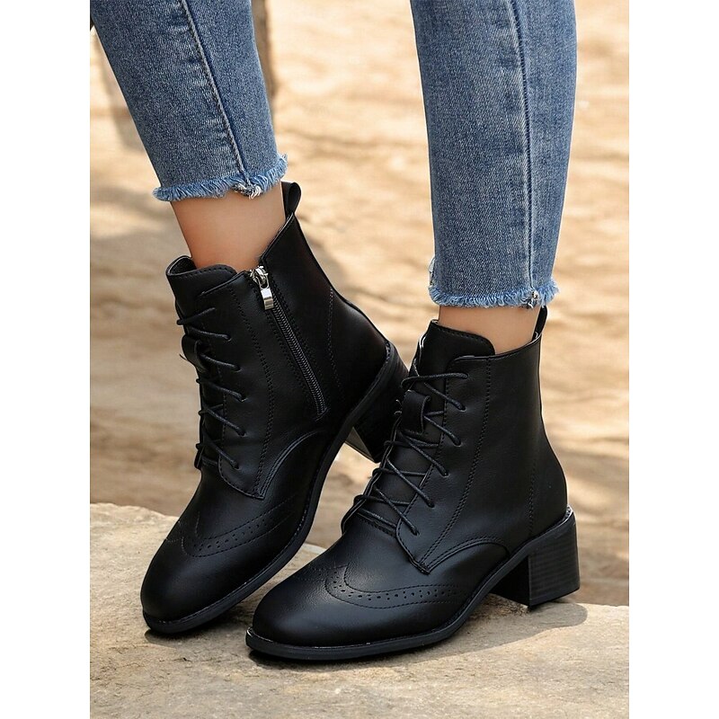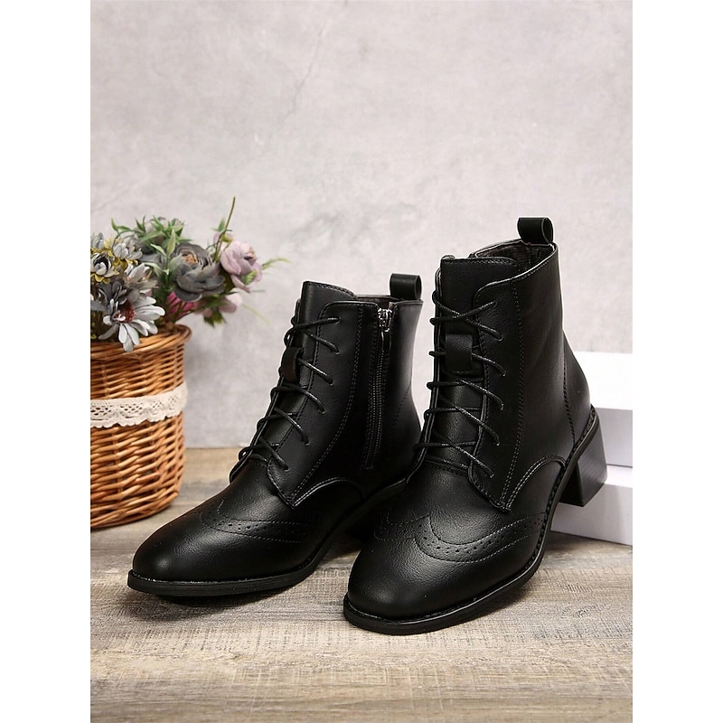Highlights [Fabric] : Crafted from high-quality faux leather, these women's ankle boots offer a durable yet stylish appearance. The material ensures comfort and longevity, perfect for daily wear throughout the fall and winter seasons. [Silhouette] : Featuring a classic lace-up design, these boots embrace a timeless brogue detailing that adds an elegant touch to any wardrobe. The vintage wingtip style paired with a chunky, stacked heel offers both sophistication and stability, suitable for all-day wear. [Design Highlights] : The boots are adorned with decorative perforations and brogue detailing, providing a refined, vintage aesthetic. The square toe design and fleece lining add a modern twist, while the inclusion of a convenient side zipper allows for easy wear and removal. [Occasions] : These versatile boots are ideal for casual outings, daily wear, or even more polished, everyday occasions. They pair effortlessly with a variety of outfits, making them a perfect addition to your fall and winter wardrobe. [Size Range] : Available in a comprehensive size range from US5.5 / EU35 to US10.5 / EU42, ensuring a suitable fit for a variety of foot sizes.